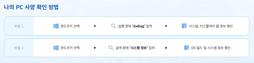 구분CPUGPURAM저장장치최소 사양 i5 10세대 RTX 2060 12GB SSD 권장 사양 i7 12세대 RTX 3070 16GB SSD 최고 사양 i9 14세대 RTX 4080 이상 32GB SSD NVMe